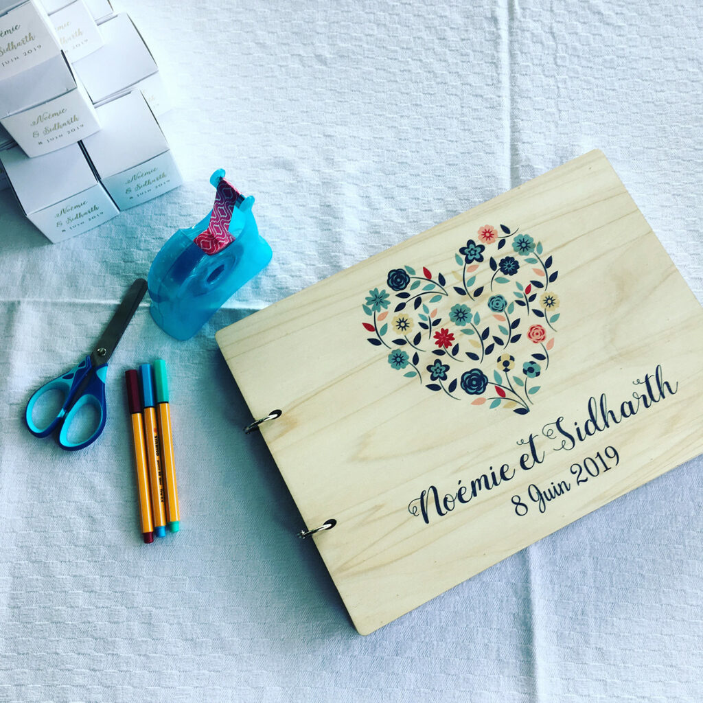 - livre d’or en bois permettant aux invités de coller la photo et de laisser un petit mot